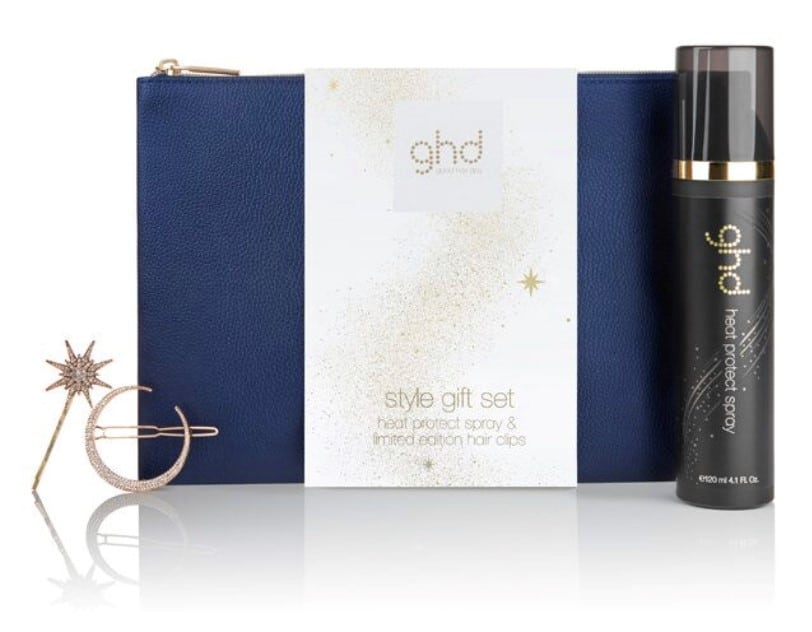 Ghd Heat Protection Spray to protect the hair from heated styling tools complete with two sparkling hair slides and plush midnight blue storage/make-up bag/hair accessories bag